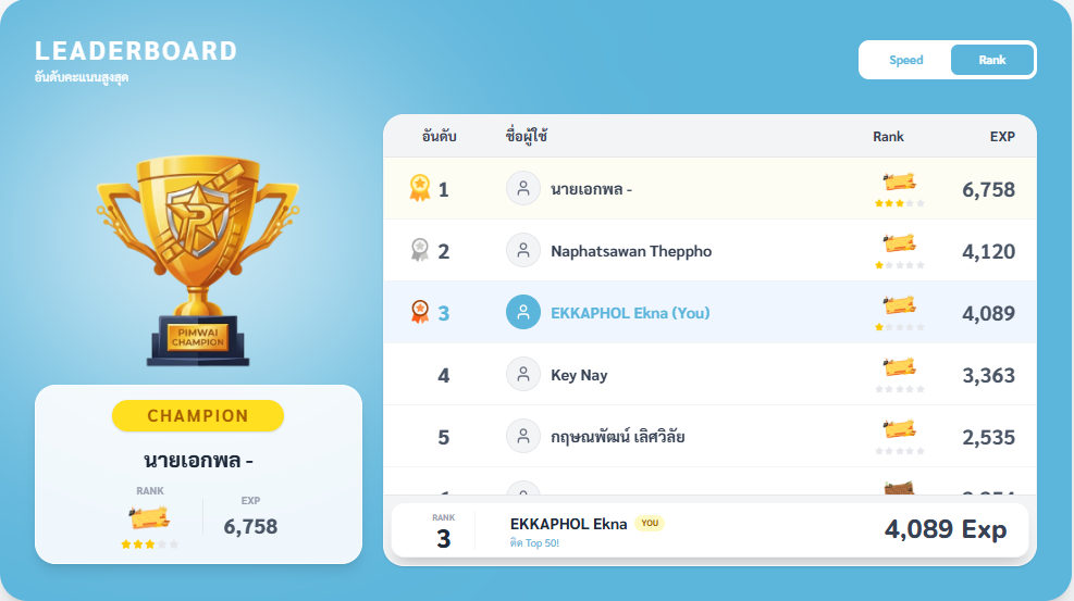 พิสูจน์ความสามารถของคุณด้วยระบบแรงค์สุดเข้มข้น ตั้งแต่ Bronze จนถึง Grandmaster ยิ่งฝึกมาก ยิ่งเก่งเร็ว และแน่นอน... ยิ่งได้โชว์แรงค์สวยๆ ให้เพื่อนอิจฉา!